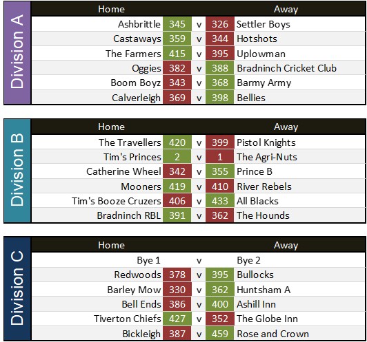 Settler Boys 415 v Tim’s princes 425 on night due to 12 pins deduction for Tim’s princes for late cancellation ruling final score Settler Boys 415 Tim’s princes 413