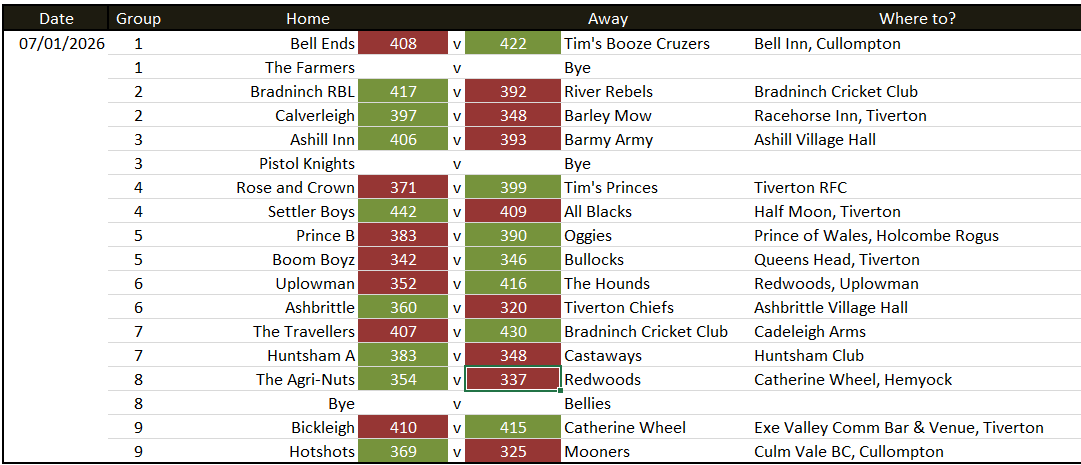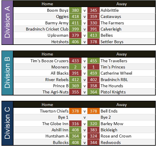Tiverton Chiefs 398 Tim’s Booze Cruzers 409